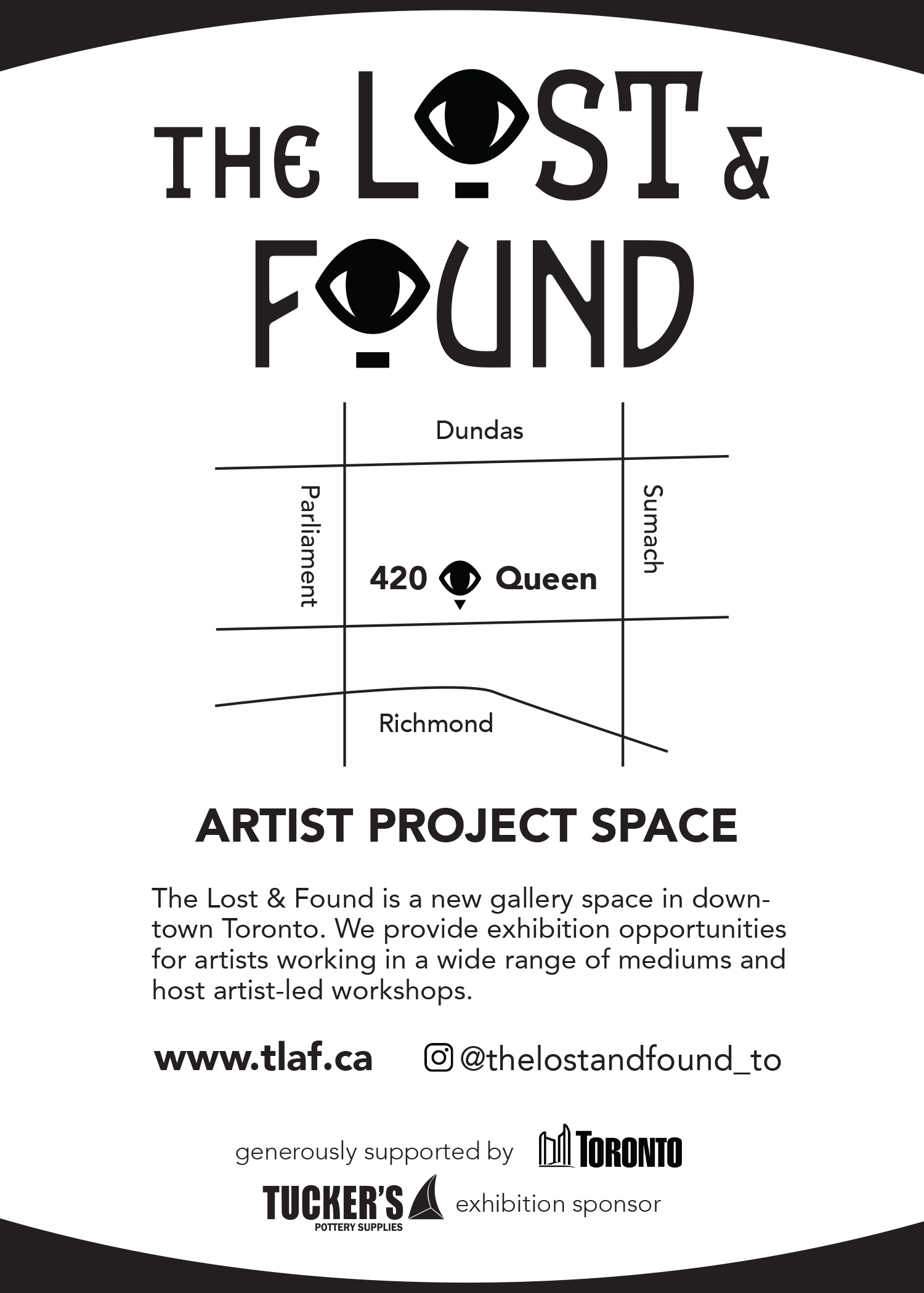 The Lost & Found is a new project space accepting submissions from independent curators, artist-curators, and organizations. Centrally located at Queen St E and Parliament, The Lost & Found aims to provide exhibition opportunities for emerging and established contemporary artists working in any medium. Founded by local artist Nurielle Stern, The Lost & Found was made possible by the City of Toronto Commercial Space Rehabilitation Grant Program and the gallery launch is generously supported by Tucker’s Pottery Supplies Inc.
